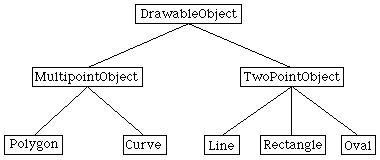 DrawableObject, MultipointObject, and TwoPointObject would be classes in the program. MultipointObject and TwoPointObject would be subclasses of DrawableObject. The class Line would be a subclass of TwoPointObject and (indirectly) of DrawableObject. A subclass of a class is said to inherit the properties of that class. The subclass can add to its inheritance and it can even "override" part of that inheritance (by defining a different response to some method). Nevertheless, lines, rectangles, and so on are drawable objects, and the class DrawableObject expresses this relationship.