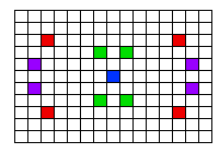 In the symmetric version, each time a square is brightened, the squares that can be obtained from that one by horizontal and vertical reflection through the center of the mosaic are also brightened. The four red squares in the picture, for example, form a set of such symmetrically placed squares, as do the purple squares and the green squares. (The blue square is at the center of the mosaic, so reflecting it doesn't produce any other squares; it's its own reflection.)
