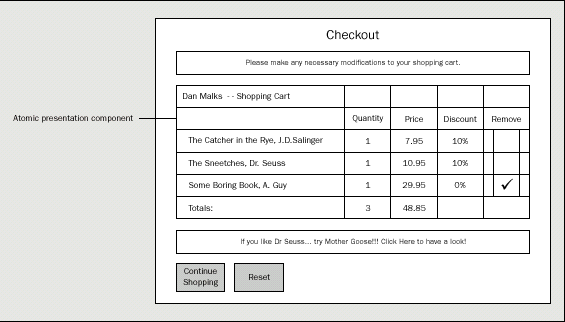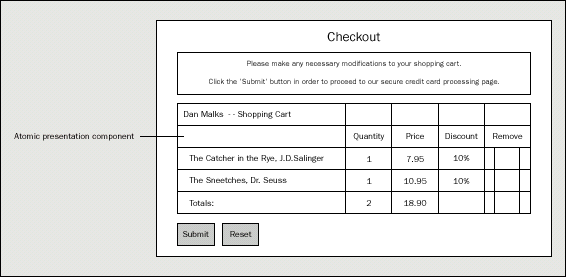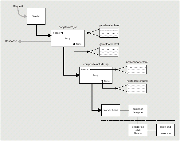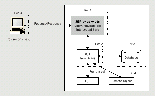 In this case, the application is composed of multiple tiers, where the middle tier, the JSP, interacts with the back end resources