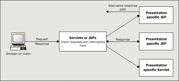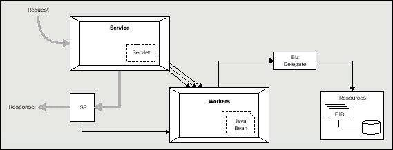 where a Servlet (or JSP) acts as a mediator or controller, delegating