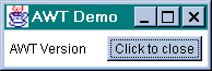 Writing the AWT versionThe code to generate an AWT frame, and a few buttons, is actually quite small. Figure 3 shows the application in action, and you should examine the source code. Next, we'll show you how to convert it into a Swing application. import java.awt.*; import java.awt.event.*; public class AWTFrame { public static void main (String args[]) throws Exception { Frame frame = new Frame("AWT Demo"); Label label = new Label ("AWT Version"); Button button = new Button ("Click to close"); button.addActionListener( new ActionListener() { public void actionPerformed(ActionEvent evt) { System.exit(0); } }); // Set layout manager frame.setLayout( new FlowLayout() ); // Add to frame frame.add( label ); frame.add( button ); frame.pack(); // Center the frame Toolkit toolkit = Toolkit.getDefaultToolkit(); // Get the current screen size Dimension scrnsize = toolkit.getScreenSize(); // Get the frame size Dimension framesize= frame.getSize(); // Set X,Y location frame.setLocation ( (int) (scrnsize.getWidth() - frame.getWidth() ) / 2 , (int) (scrnsize.getHeight() - frame.getHeight()) / 2); frame.setVisible(true); } }
